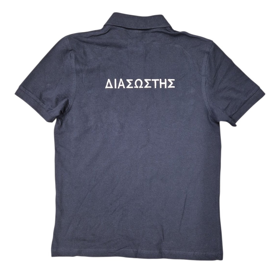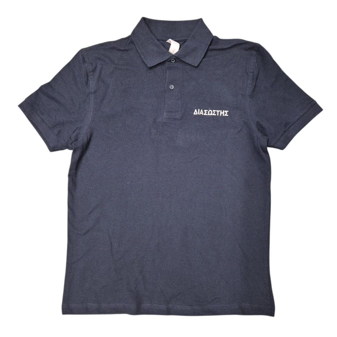Μπλουζάκι κοντομάνικο με γιακά - πόλο με κέντημα στο στήθος και στην πλάτη "ΔΙΑΣΩΣΤΗΣ". Μπλέ μπλουζάκι με άσπρο κέντημα ΔΙΑΣΩΣΤΗΣ. Σύνθεση με βάση το βαμβάκι.