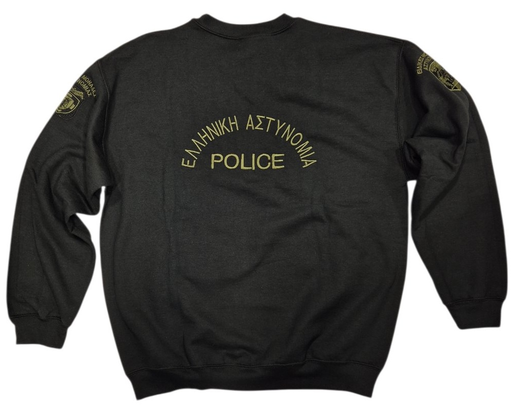 Φούτερ βαρύ με λάστιχο στην μέση, με κέντημα POLICE μπροστά και πίσω και ΔΙΑΣ στο μανίκι. Κεντήματα χαμηλής ορατότητας (λαδί χρώμα). Σύνθεση με βάση το βαμβάκι. Στα υπερμεγέθη η τιμή διαφοροποιείται.