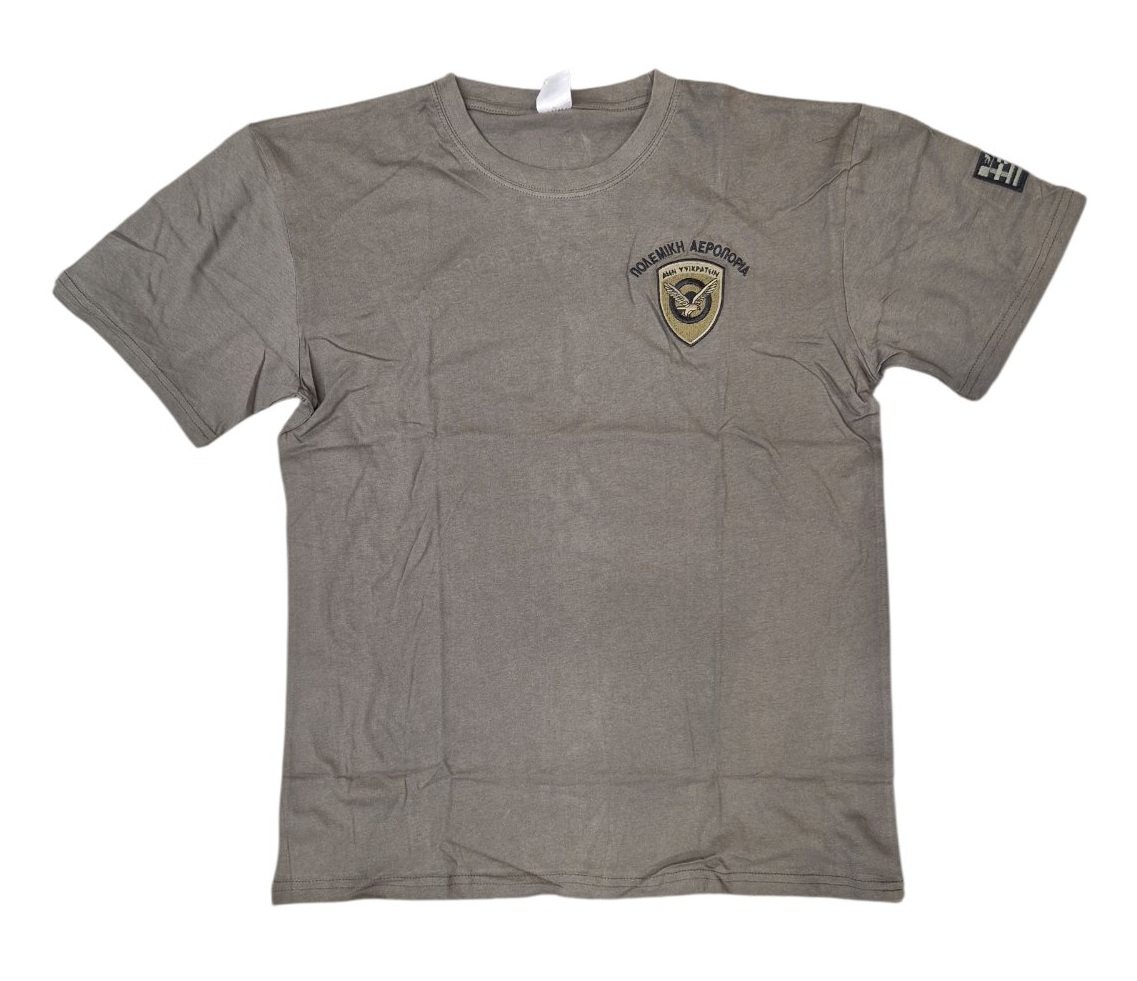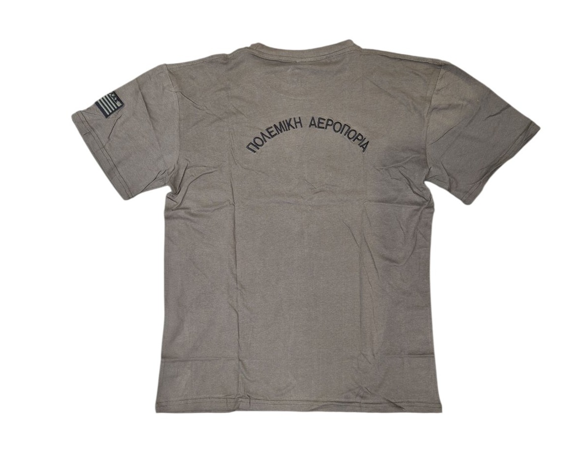Μπλουζάκι κοντομάνικο μονόχρωμο λαδί, με κέντημα μπροστά το σήμα της Πολεμικής Αεροπορίας και πίσω "Πολεμική Aεροπορία". Βαμβακερό 100%.